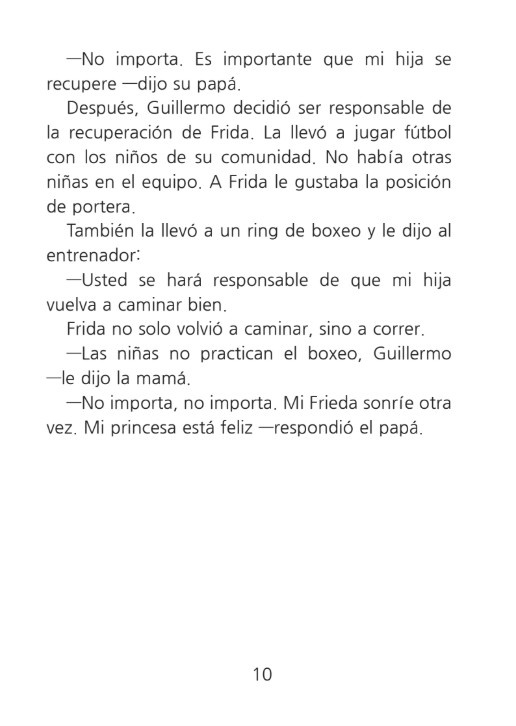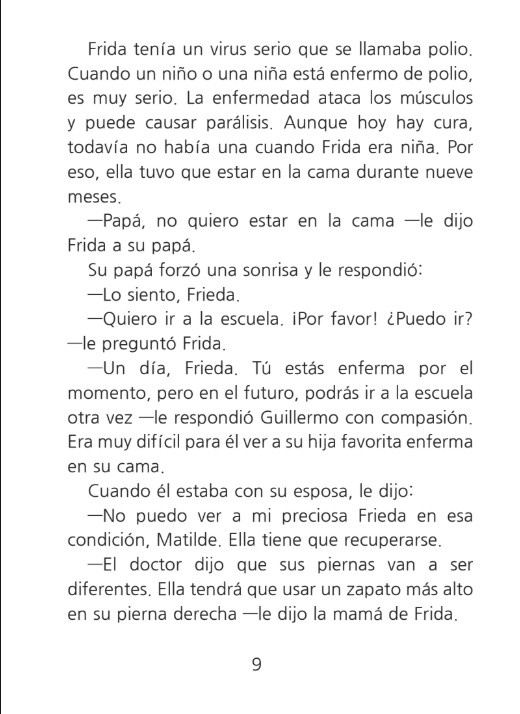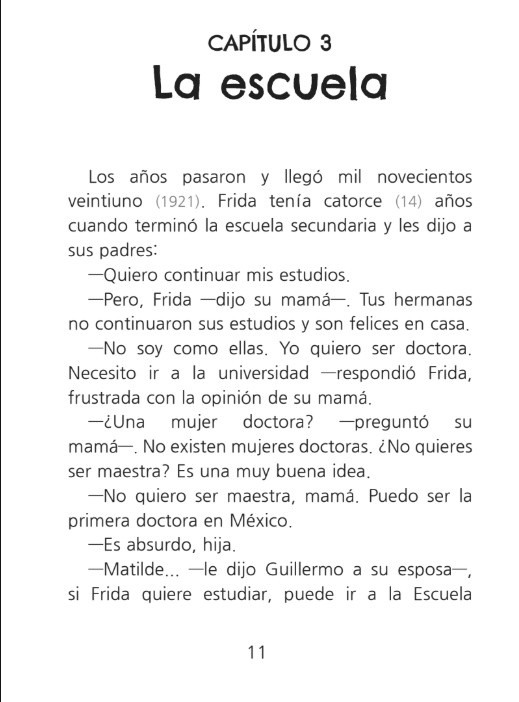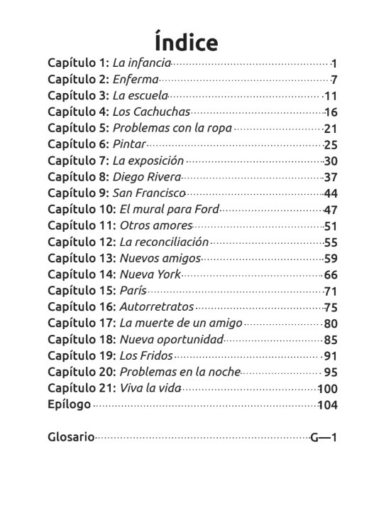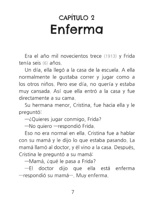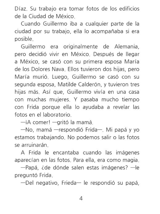 Dit boek is een biografie over Frida Kahlo, geschreven om leerlingen en cursisten die Spaans leren te helpen bij het verwerven van de taal. Dit boekje is geïnspireerd op Frida Kahlo's kunst en leven! Het is echter geen officiële biografie. Sommige scènes zijn vereenvoudigd om aan te sluiten bij het taalniveau van de leerlingen en cursisten. Een paar momenten zijn mogelijk ook verfraaid of gefictionaliseerd om een natuurlijk, begrijpelijk verhaal te creëren en belangrijke woordenschat en structuren te bekrachtigen. Er is alles aan gedaan om de geest en verdiensten van Frida te eren en tegelijkertijd haar verhaal toegankelijk te maken voor leerlingen en cursisten die Spaans leren.