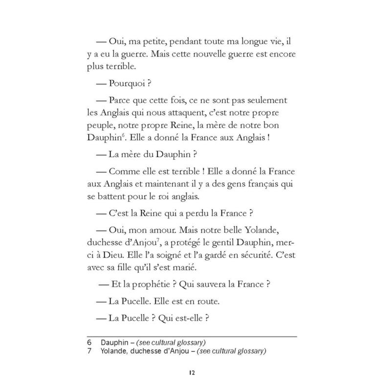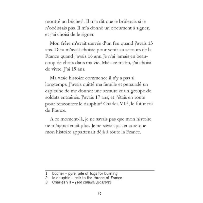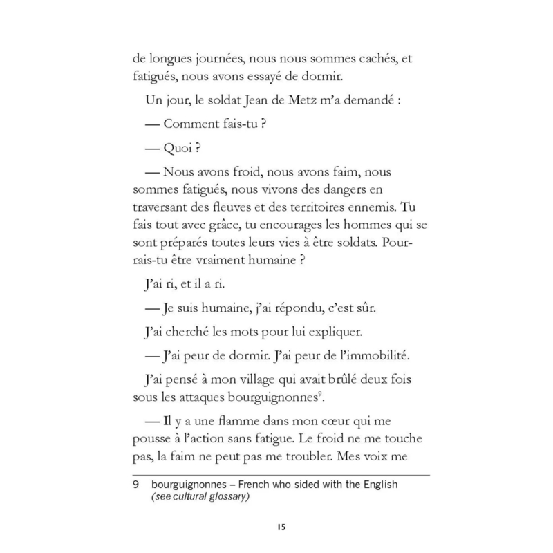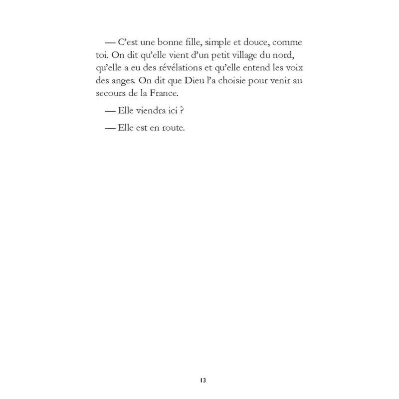 OverviewJe pouvais lire la terreur dans les yeux des soldats qui avaient été assiégés pendant les six derniers mois, mais avec moi ils ont retrouvé leur courage. J’ai levé mon drapeau dans l’air et je me suis approchée sans peur. Les Anglais nous regardaient approcher du haut de la fortifi cation de Saint-Loup . Leurs fl èches tombaient sur nous comme de la pluie. J’entendais les cris des hommes tombés. J’ai continué à avancer. J’ai crié : — Allez-y ! Continuez ! Dieu est avec vous. Ne vous arrêtez pas. La France est à nous !