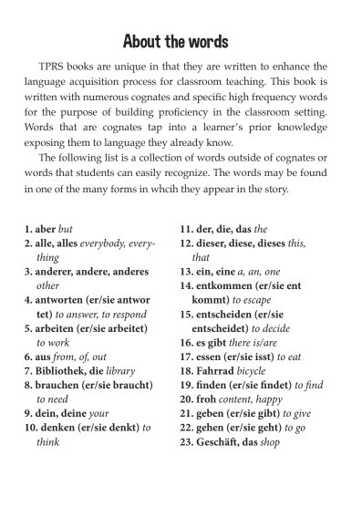 This book has been written based on Blaine Ray's Cat Story that was first written in Look, I Can Talk in 1989. Blaine's first book stressed the importance of making learning languages easier and the experience for students exciting and interesting. The mission of this story is to add innovation to Blaine's original creation while making it an amazing adventure and reading experience for teachers and students alike. This story is about celebrating the past and never forgetting the focus on the student experience. We hope that each opportunity to make your own story is a fun and funny experience and that readers will want to read and explore each adventure as they acquire German.