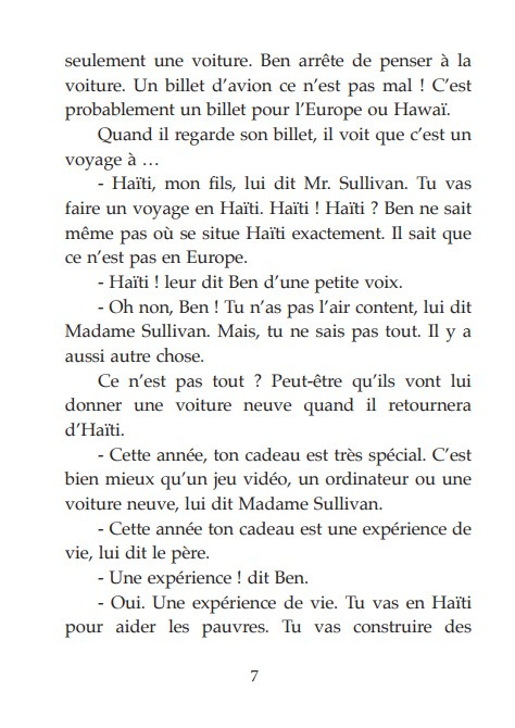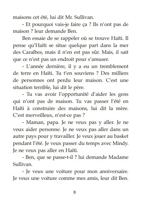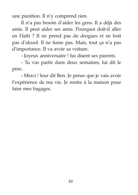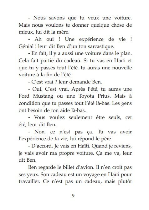 Ben, a seventeen year-old high school student, has high hopes for getting a car for his birthday. When the big day comes he does not get a car but his parents promise him one if he spends the summer in Haiti rebuilding houses for earthquake victims. Ben goes to Haiti even though he doesn't want to. He doesn't really like the work but in the end he appreciates the Haitian people and culture. At the end of the summer when he returns home, he make an unexpected decision...