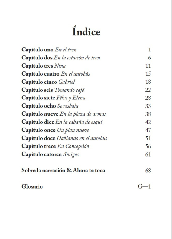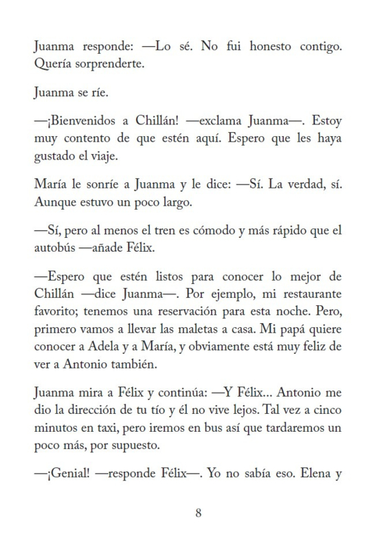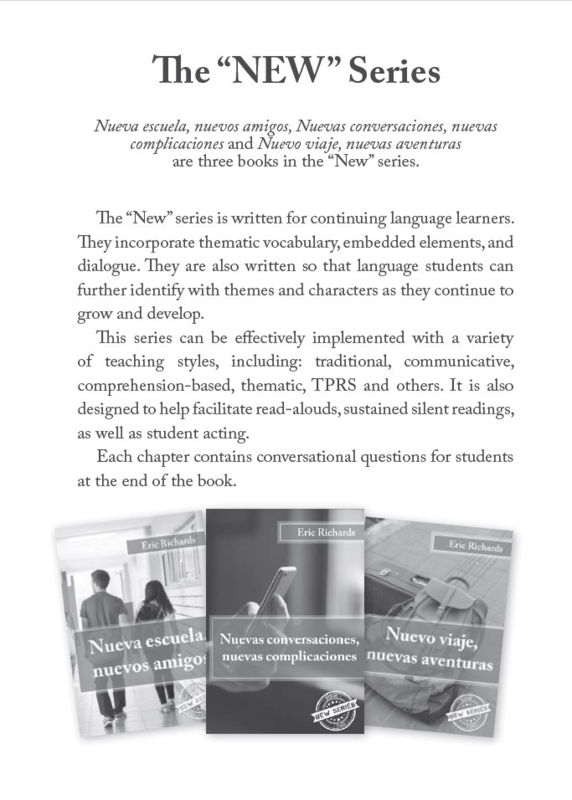 For educators: Nuevo viaje, nuevas aventuras is a chapter book for lower advanced language learners. It incorporates thematic vocabulary, embedded elements and dialogue. It is written so that beginning language students can identify with themes and characters as they grow and develop. The book can be effectively implemented with a variety of teaching styles, including: traditional, communicative, thematic, TPRS, CI and others. It is also designed to help facilitate read-alouds, sustained silent readings, student acting, personalization, interaction and more. At the end of the book there are general comprehension questions per chapter. Below it are individualized questions, designed to give students more practice with the structures and vocabulary by allowing the student to engage and respond in a personalized manner. This section is easily expandable and lends itself well for PQA sessions, class discussions and personalization in the classroom.